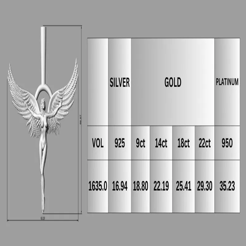 The Angel Wing Pendant 3D Model for Jewelry is a stunning piece that captures the essence of elegance and grace. Crafted with meticulous attention to detail, this pendant features intricate designs that symbolize beauty and spirituality. Made for those who appreciate fine craftsmanship, this pendant is a true masterpiece that will elevate any jewelry collection. The 3D model size measures 66.67 x 60.29, with a volume of 1635.0 and a gold weight of 29.30. The file type is STL, and the model type is pendant. Compatible with software like Rhino, ZBrush, and Magics, this pendant is a must-have for anyone who appreciates artistry and quality.