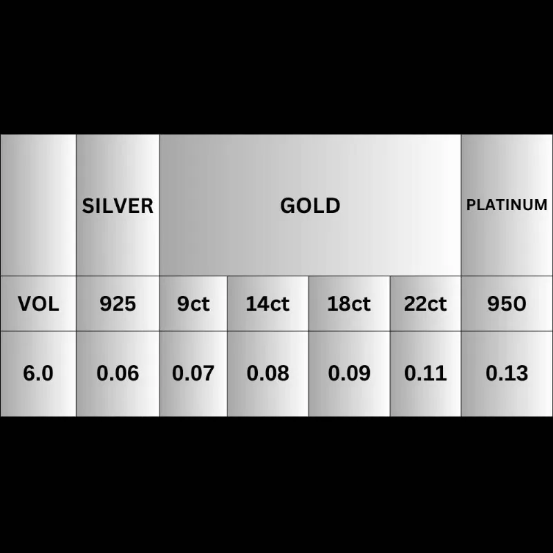 - Specifications: This model has a size of 2.41 x 3.85 and a volume of 6.0. Estimated Gold Weight: 0.11